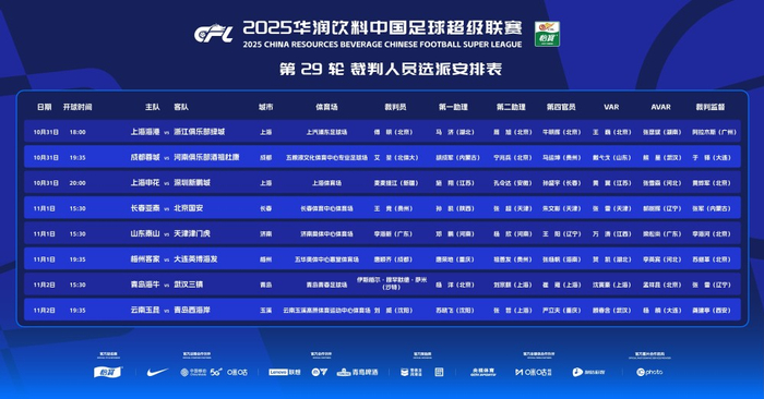 中超29轮裁判表出炉:傅明盯海港,伊斯梅尔客串引发眼球